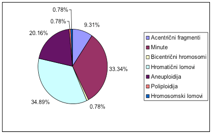 Na osnovu dobijenih rezultata dolazimo do zaključka da od ukupno 50 ispitanika koji rade sa izvorima jonizirajućeg zračenja kojima su konstatovane hromosomske aberacije, najučestalije su hromatični lomovi sa frekvencijom od 45 (33,89%), zatim minute sa 43 (33,34%) i aneuploidije sa 26 (20,16%), te acentrični fragmenti sa 12 (9,31%), bicentrični hromosomi, poliploidija i hromosomski lomovi sa 1 (0,78%) (Tabela 1, Slika 2.).