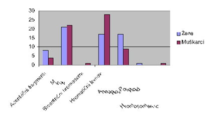 U skupini žena (22 individue) najzastupljenije hromosomske aberacije su minute sa frekvencijom 21 (32,82%), zatim hromatični lomovi 17 (26,56%), aneuploidije 17 (26,56%), acentrični fragmenti sa 8 (12,50%), i poliploidije sa 1 ( 1,56%). U skupini muškaraca (28 individua) najzastupljenije hromosomske aberacije su hromatični lomovi sa frekvencijom 28 (43,07%), zatim minute sa 22 (33,85%), aneuploidije 9 (13,85%), te acentrični fragmenti sa 4 (6,15%), bicentrični hromosomi 1 (1,54%) i hromozomski lomovi sa 1 ( 1,54%).